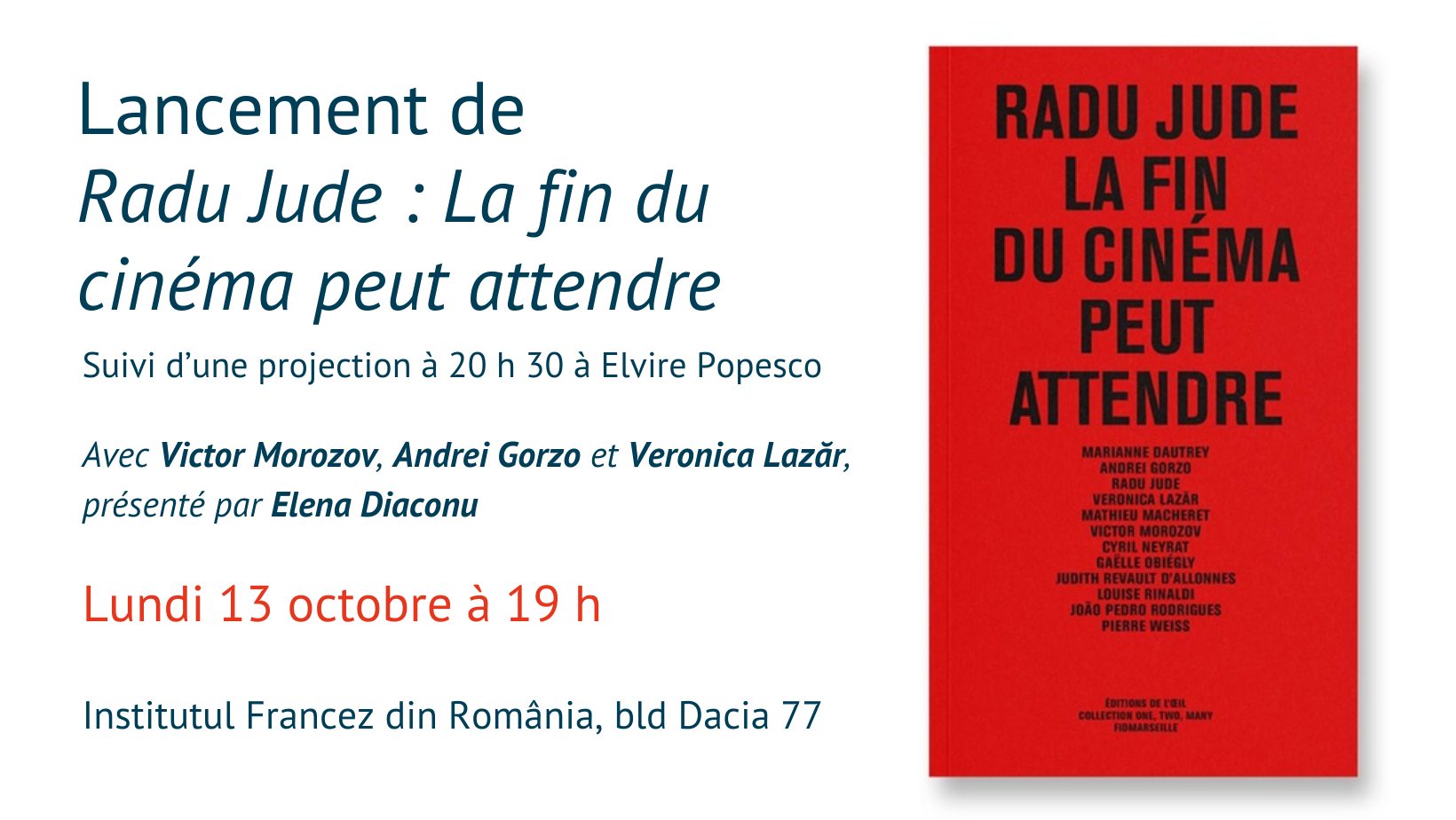 Cu aceastฤ ocazie, trei dintre autori โ critici romรขni de film โ ๐๐ข๐๐ญ๐จ๐ซ ๐๐จ๐ซ๐จ๐ณ๐จ๐ฏ, ๐๐ง๐๐ซ๐๐ข ๐๐จ๐ซ๐ณ๐จ ศi ๐๐๐ซ๐จ๐ง๐ข๐๐ ๐๐๐ณ๐ฬ๐ซ, vor prezenta contribuศia lor la prima monografie dedicatฤ lui Radu Jude, รฎn cadrul unei conversaศii moderate de ๐๐ฅ๐๐ง๐ ๐๐ข๐๐๐จ๐ง๐ฎ, de la librฤria Kyralina. Discuศia se va desfฤศura รฎn limba romรขnฤ, cu traducere simultanฤ รฎn limba francezฤ.
