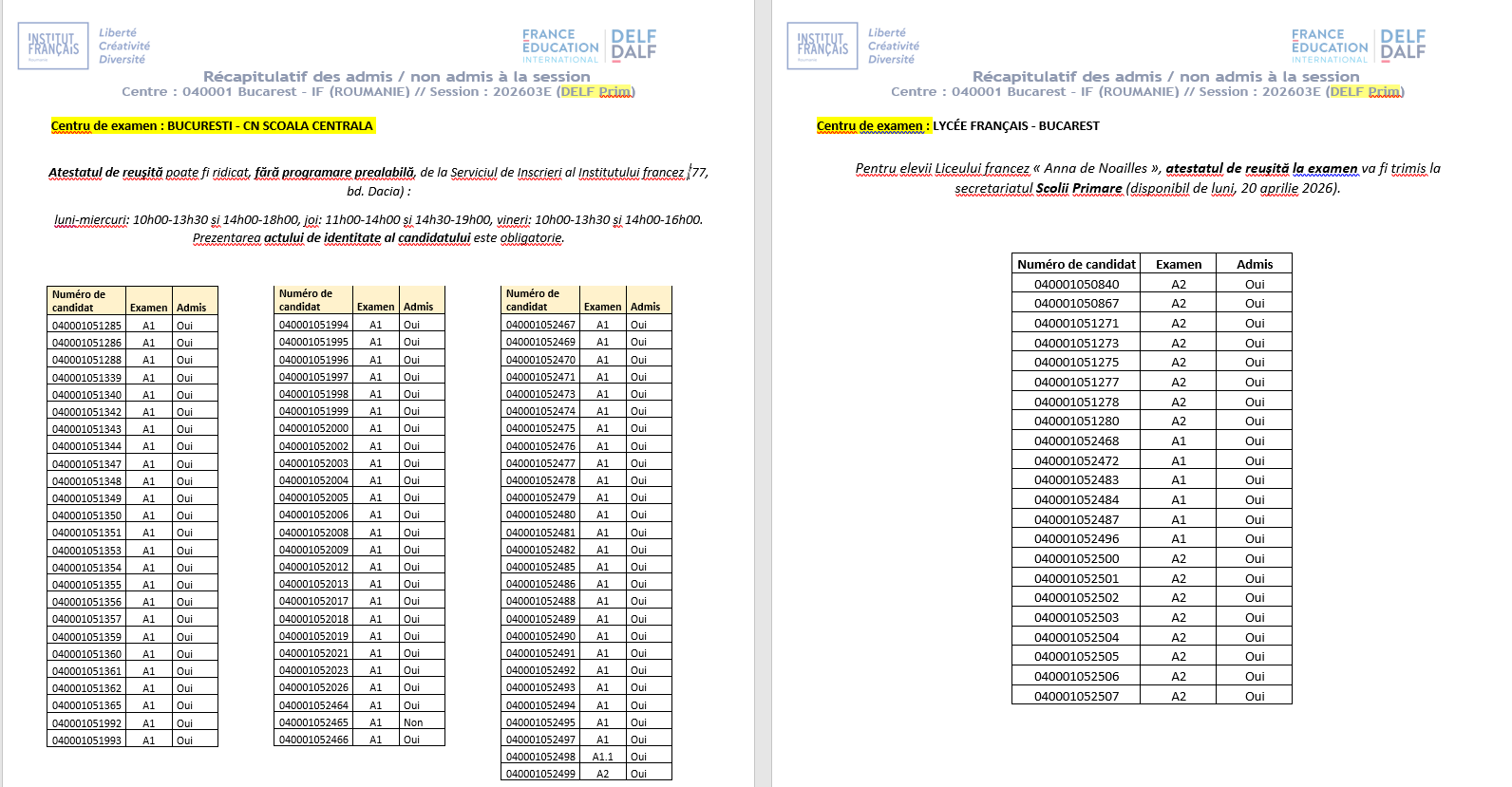 | 📣 Diplomele din sesiunea iunie 2025 pot fi ridicate* de la Serviciul de Înscrieri al Institutului Francez din România la Bucureşti de luni până miercuri între 10h00 şi 18h00, joi între 11h00 şi 19h00 şi vinerea între 10h00 şi 16h00. *Pentru ridicarea diplomei, vă rugăm să prezentați un act de identitate al candidatului. Rezultate DELF Prim – Martie 2026 |