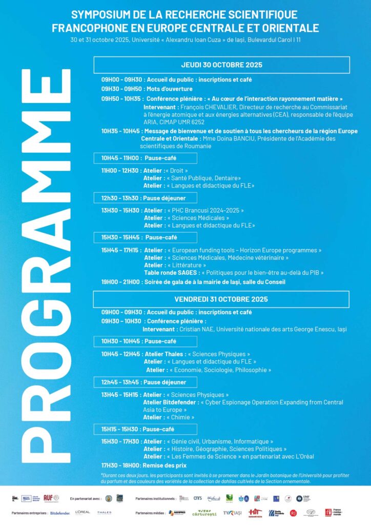 Après le succès des trois premières éditions organisées entre 2022 et 2024, l’Ambassade de France en Roumanie, en partenariat avec la direction régionale de l’Agence Universitaire de la Francophonie, lance la 4ᵉ édition du Symposium de la recherche scientifique francophone en Europe centrale et orientale (SRSF-ECO’2025).