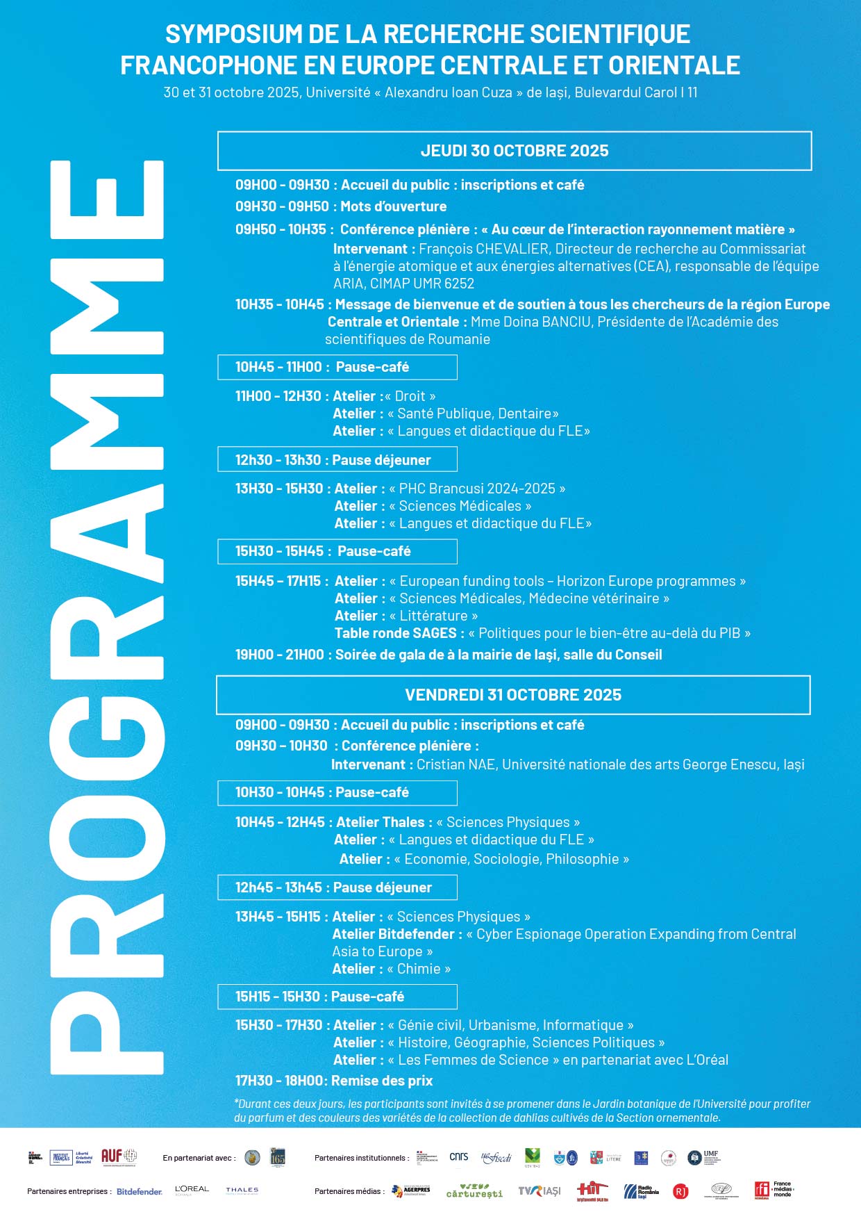Après le succès des trois premières éditions organisées entre 2022 et 2024, l’Ambassade de France en Roumanie, en partenariat avec la direction régionale de l’Agence Universitaire de la Francophonie, lance la 4ᵉ édition du Symposium de la recherche scientifique francophone en Europe centrale et orientale (SRSF-ECO’2025).