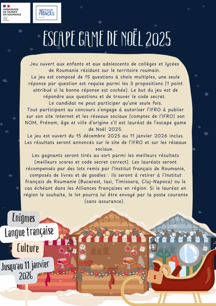 Partez à l’aventure à travers la France ! Explorez cinq villes françaises, résolvez des énigmes ludiques et répondez à des questions culturelles pour déchiffrer le grand code secret de Noël.
