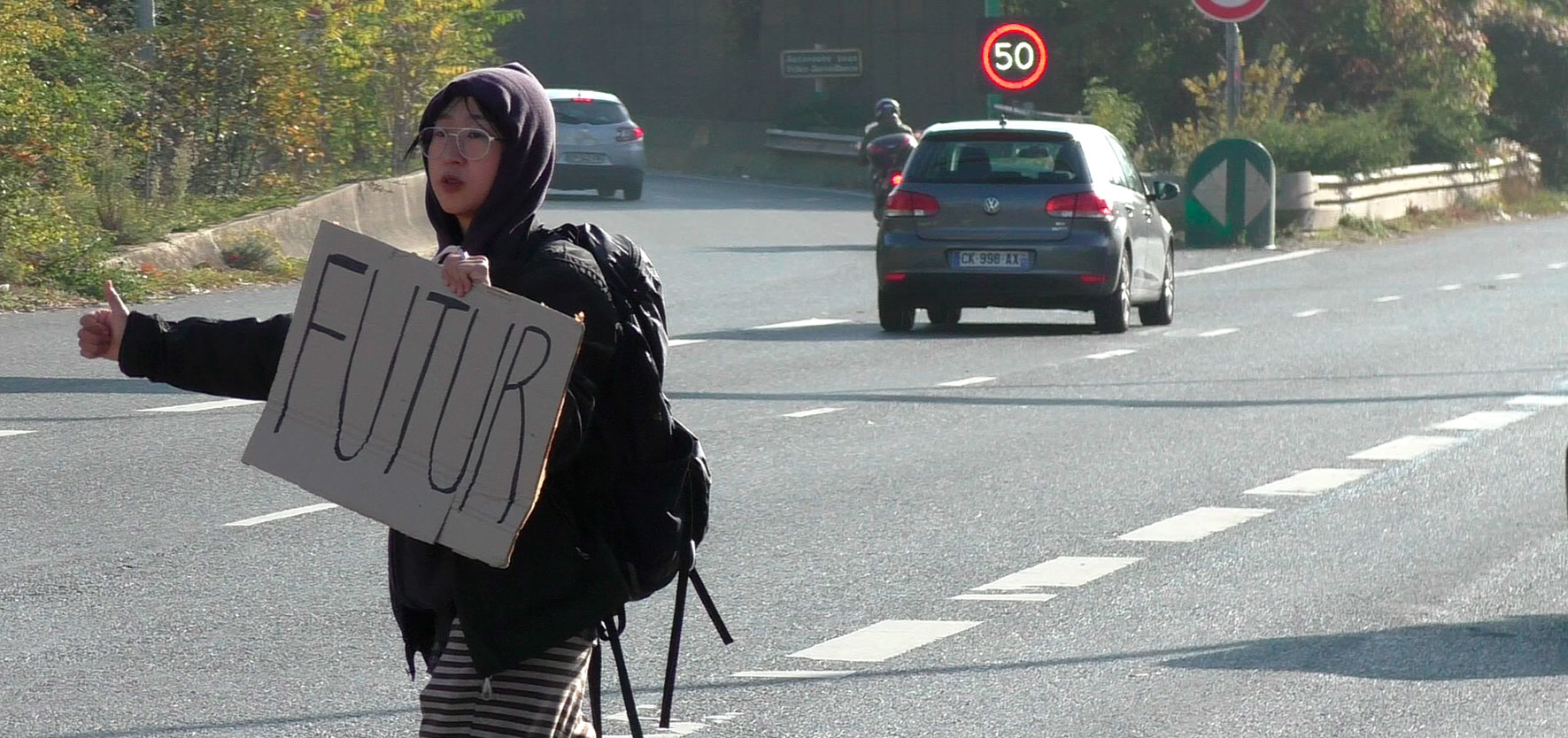 S’ajoutent également ses ressentis de l’arrivée et du départ, comme un revival condensé de son parcours de vie. Excitation et désorientation d’une arrivée dans un territoire inconnu ; nostalgie et désarroi de quitter ce lieu désormais familier. Elle met en films ces va-et-vient, dans la continuité de l’œuvre J’ai besoin de la chance : sa caméra posée à la vitre de la voiture qui l’emmène à l’aéroport enregistre son trajet, l’éloignement progressif et les changements du paysage. Elle a réitéré pour une quatrième fois, à son retour de Roumanie, son action performative filmée, Past and Future, où elle fait du stop avec comme destination le passé ou le futur.