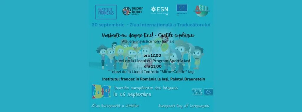 Institutul Francez din Romania la Iaşi, Asociația SUPER TINERI (ASIRYS), ESN – Erasmus Student Network Iasi și EUROPE Direct Iasi celebrează, din nou, împreună, Ziua Europeană a Limbilor. Anul acesta, evenimentul are loc pe 30 septembrie – 𝐙𝐢𝐮𝐚 𝐈𝐧𝐭𝐞𝐫𝐧𝐚𝐭̦𝐢𝐨𝐧𝐚𝐥𝐚̆ 𝐚 𝐓𝐫𝐚𝐝𝐮𝐜𝐚̆𝐭𝐨𝐫𝐮𝐥𝐮𝐢, , la etajul I al Palatului Braunstein.