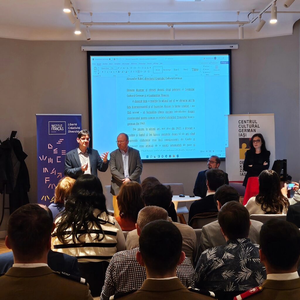 Cu această ocazie, Centrul Cultural German și Institutul Francez din Iași vă invită la Palatul Braunstein, de la ora 17:00, la conferința: 𝑴𝒊𝒛𝒆𝒍𝒆 𝒈𝒆𝒐𝒑𝒐𝒍𝒊𝒕𝒊𝒄𝒆 𝒄𝒐𝒏𝒕𝒆𝒎𝒑𝒐𝒓𝒂𝒏𝒆 𝒂𝒍𝒆 𝑻𝒓𝒂𝒕𝒂𝒕𝒖𝒍𝒖𝒊 𝒅𝒆 𝒍𝒂 𝑬́𝒍𝒚𝒔𝒆́𝒆. 𝑫𝒆 𝒍𝒂 𝒓𝒆𝒄𝒐𝒏𝒄𝒊𝒍𝒊𝒆𝒓𝒆𝒂 𝒇𝒓𝒂𝒏𝒄𝒐-𝒈𝒆𝒓𝒎𝒂𝒏𝒂̆ 𝒍𝒂 𝒈𝒖𝒗𝒆𝒓𝒏𝒂𝒏𝒕̦𝒂 𝒆𝒖𝒓𝒐𝒑𝒆𝒂𝒏𝒂̆.