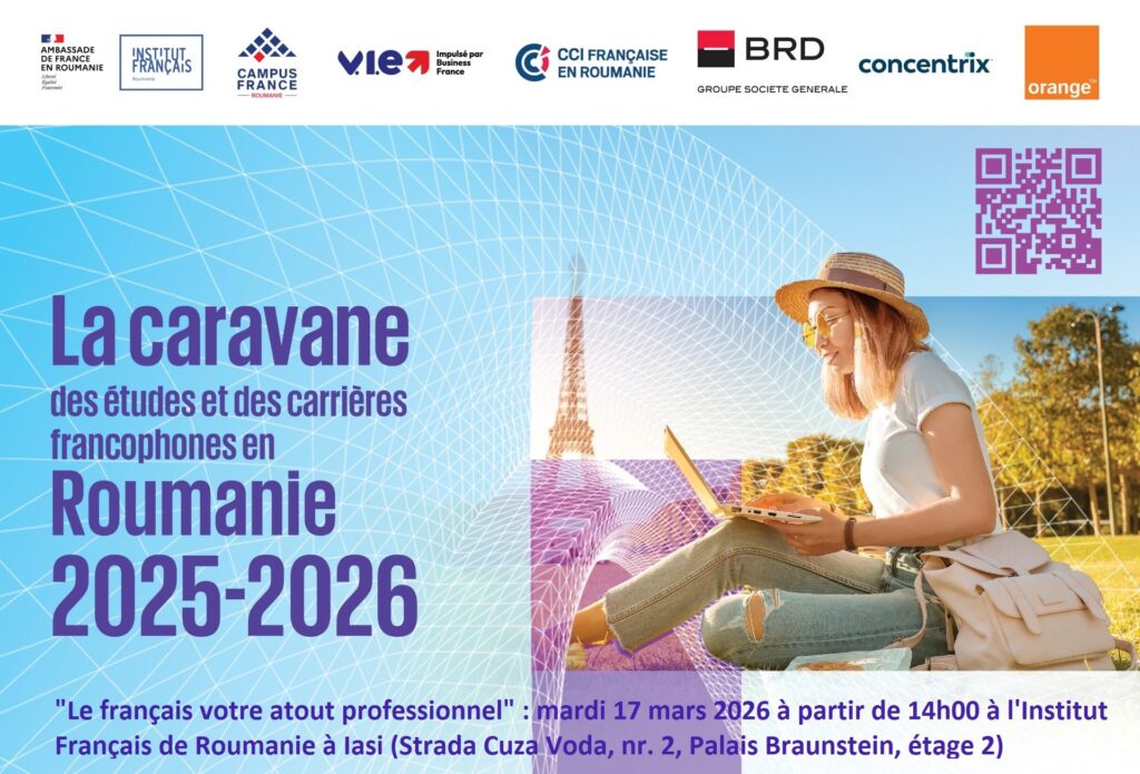 Evenimentul „Limba franceză, atuul dumneavoastră profesional” va avea loc marți, 17 martie 2026, începând cu ora 14:00, la Institutul Francez din România, Iași (Palatul Braunstein, etajul 1), în cadrul Caravanei studiilor și carierelor francofone și a lunii Francofoniei. Cu această ocazie, liceenilor și studenților din Iași li se vor prezenta oportunitățile și avantajele studiilor în Franța pentru succesul carierei lor profesionale. Mărturiile studenților care studiază limba franceză, ale foștilor bursieri în Franța, ale persoanelor care lucrează în limba franceză și ale angajatorilor de francofoni din Iași vor fi la ordinea zilei în cadrul acestei întâlniri care se anunță a fi foarte interesantă.
